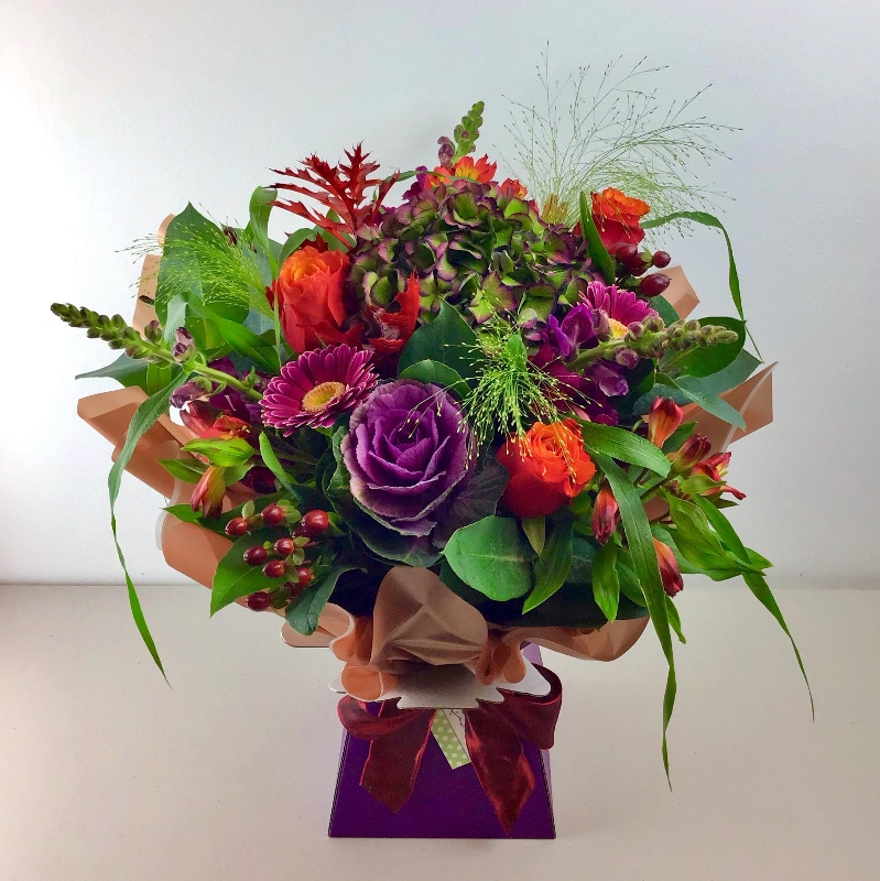 The flowers included in this arrangement will vary from those shown. Our seasonal stock is constantly changing, so that each and every design we make will be interesting and unique. It will however, always match your chosen colour scheme. These strong coloured blooms require 48hrs notice to order.