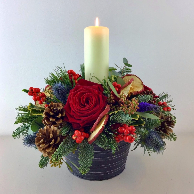 A luxury Christmas candle arrangement of fresh Christmas foliage and berries, with velvety red roses, blue thistles and dried apple slices in a lovely burnished birch, tin or ceramic container.