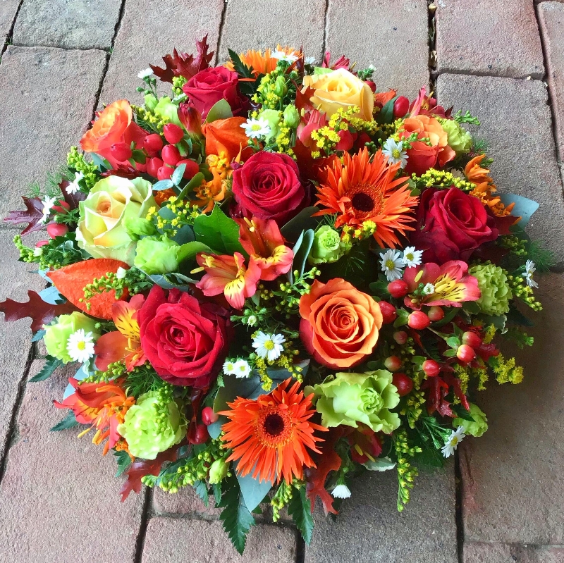 A posy pad of beautiful fresh flowers and foliage in the rich colours of Autumn.