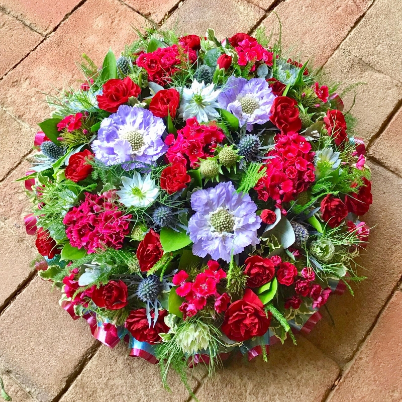 A posy pad of fresh flowers and foliage chosen from our ever changing selection of seasonal blooms.