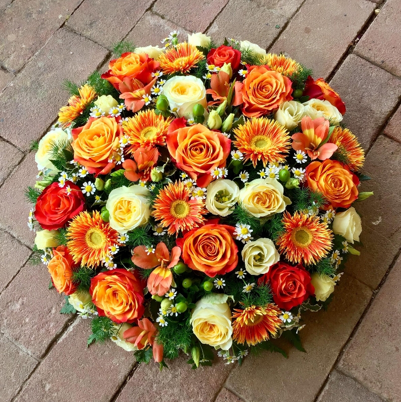 A bright posy pad of fresh flowers and foliage in lovely shades of oranges, lemons and creams.