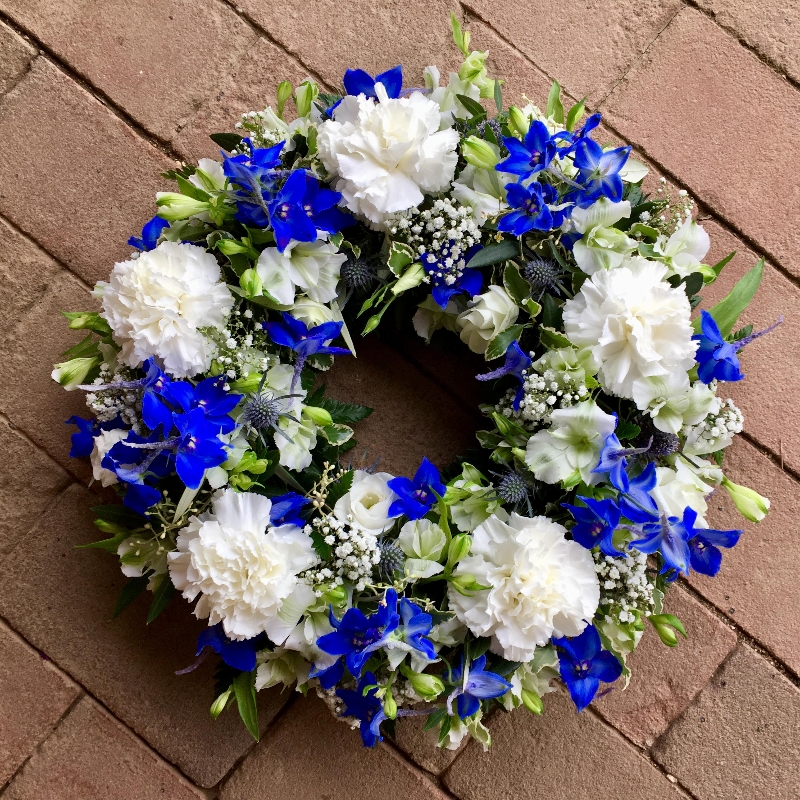 A  traditional wreath of lovely mixed flowers in blue and white.