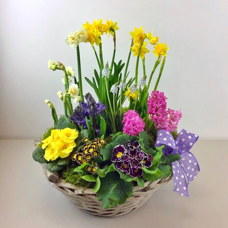 Scented Spring bulbs and Primula planted in a large rustic basket or container.