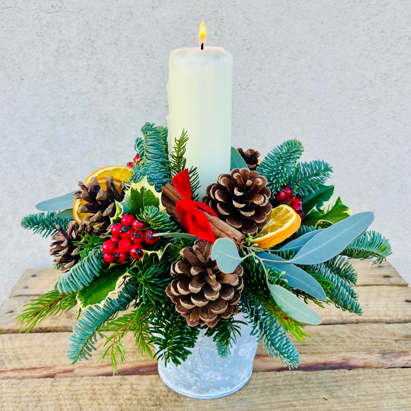 Fresh Christmas foliage, cinnamon, dried orange slices, pine cones and berries arranged in a rustic metal container with a long lasting cream chapel candle.