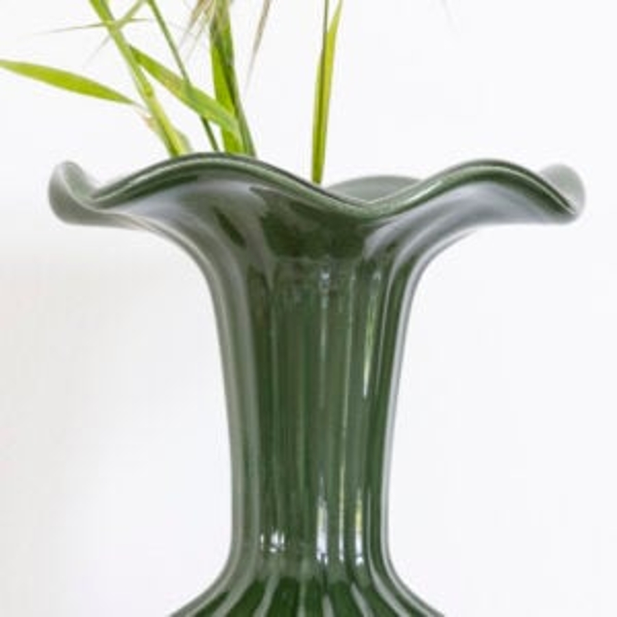 Hadley Glass Vase with Frill Rim in deep green! A delightful  vase that’s just elegant. Standing  in at 15.5cm x 26cm, this charming vase features a softly frilled rim.