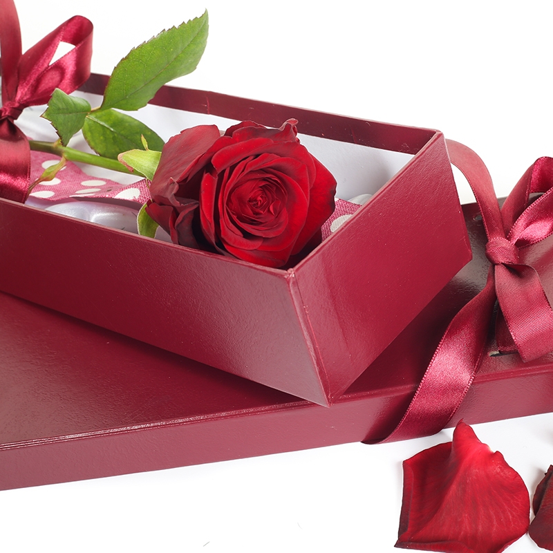 A beautiful red rose presented perfectly in a gift box. One rose for your one love.
